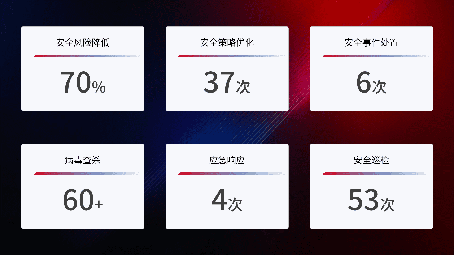 提供全面的安全事件报告体系,,包括处置报告、、、周报、、、、季度和年度总结,,,,结合持续监控,,帮助客户深入了解网络安全状况。。