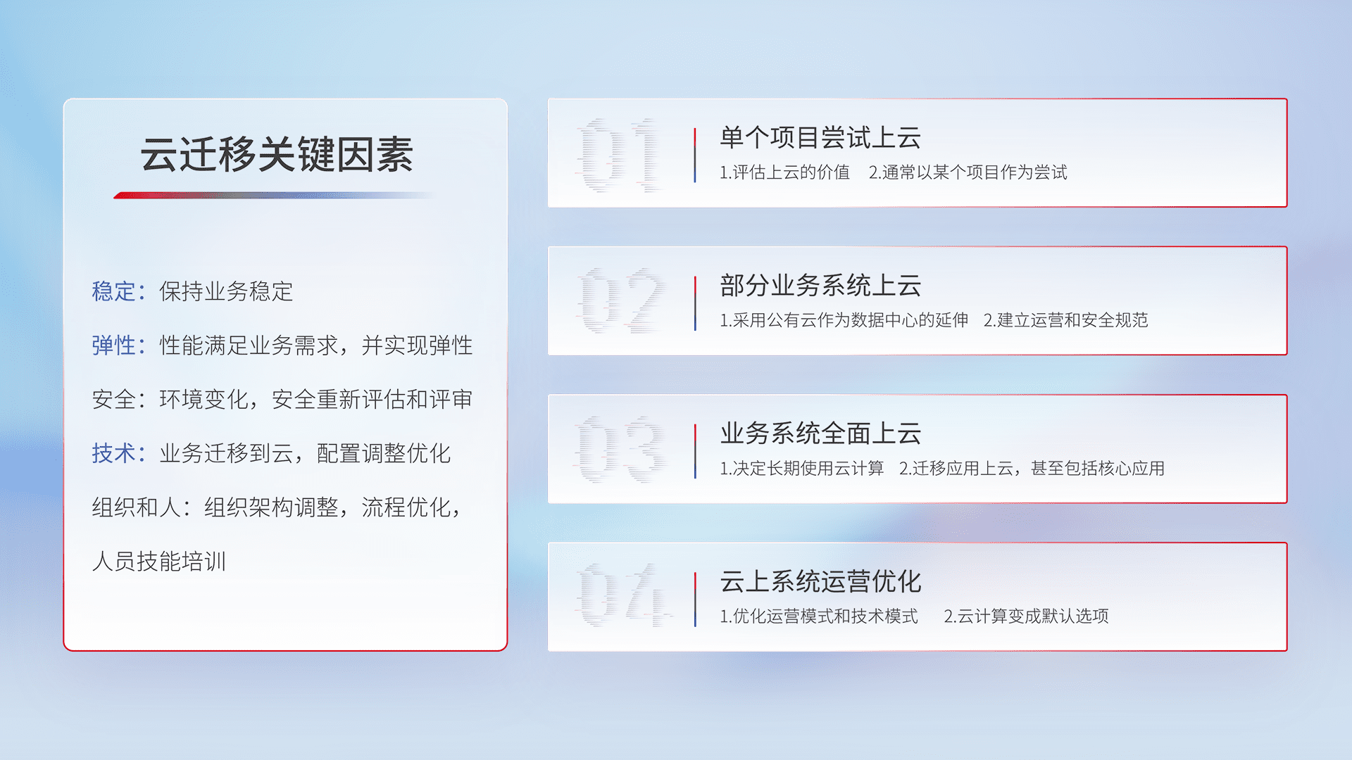 结合实际业务,,从规划设计、、、、云平台选型、、、、云原生改造、、、、数据迁移、、、、集成交付,,,,迁移全过程为客户识别最佳上云路径,,做好风险识别管理,,设计网络架构、、身份权限、、安全审计合规、、操作审计、、、日志审计、、监控告警策略、、、多站点容灾设计等,,对云上基础设施进行整体规划,,提升IT治理水平,,以满足弹性、、高可用、、、、高性能的需求。。